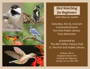 Introduction to Bird Watching – Saturday October 18th at 11 am, presented by Marcie Jacklin. Held at the Fort Erie Public Library, Centennial Branch. Free admission. Sign up through the Fort Erie Public Library website.